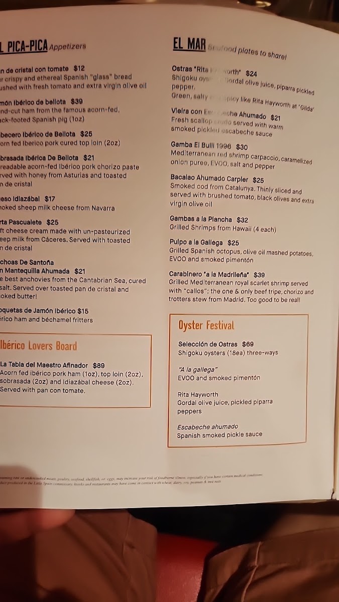 Guests often start with lighter bites like pan de cristal con tomate, a crisp, airy bread brushed with fresh tomato and olive oil, or explore cured specialties such as the rich Jamon Iberico de Bellota. These starters set a relaxed tone, perfect for pairing with a glass of Spanish wine or a refreshing cocktail in the warm, vibrant atmosphere.